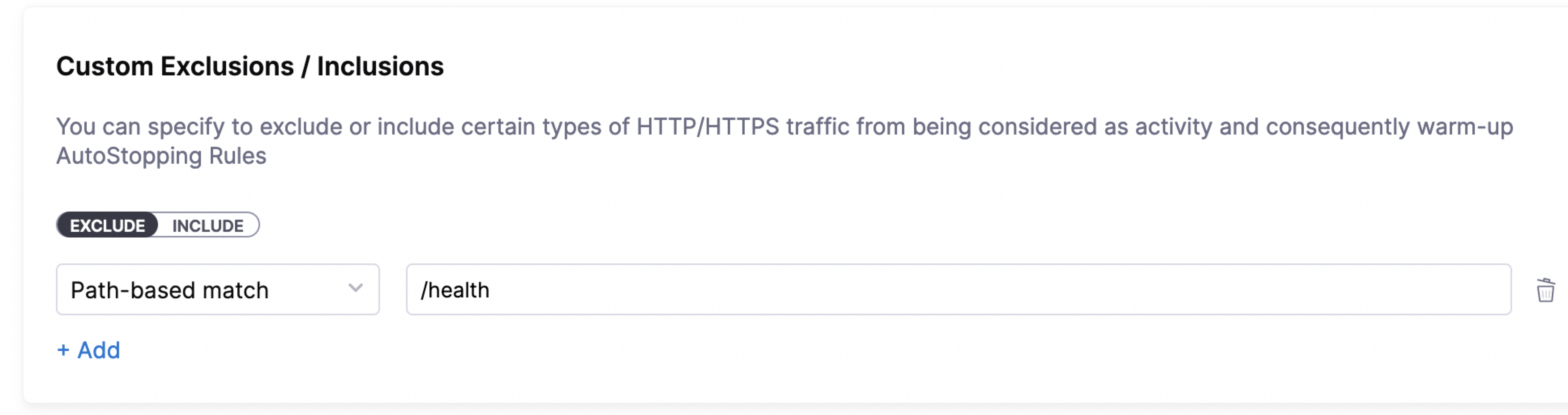 Similarly, you can configure custom inclusions. Requests to the specified path or from the specified IP address alone can invoke the cloud resource managed by AutoStopping. Only these requests are detected as traffic by the AutoStopping rule.
