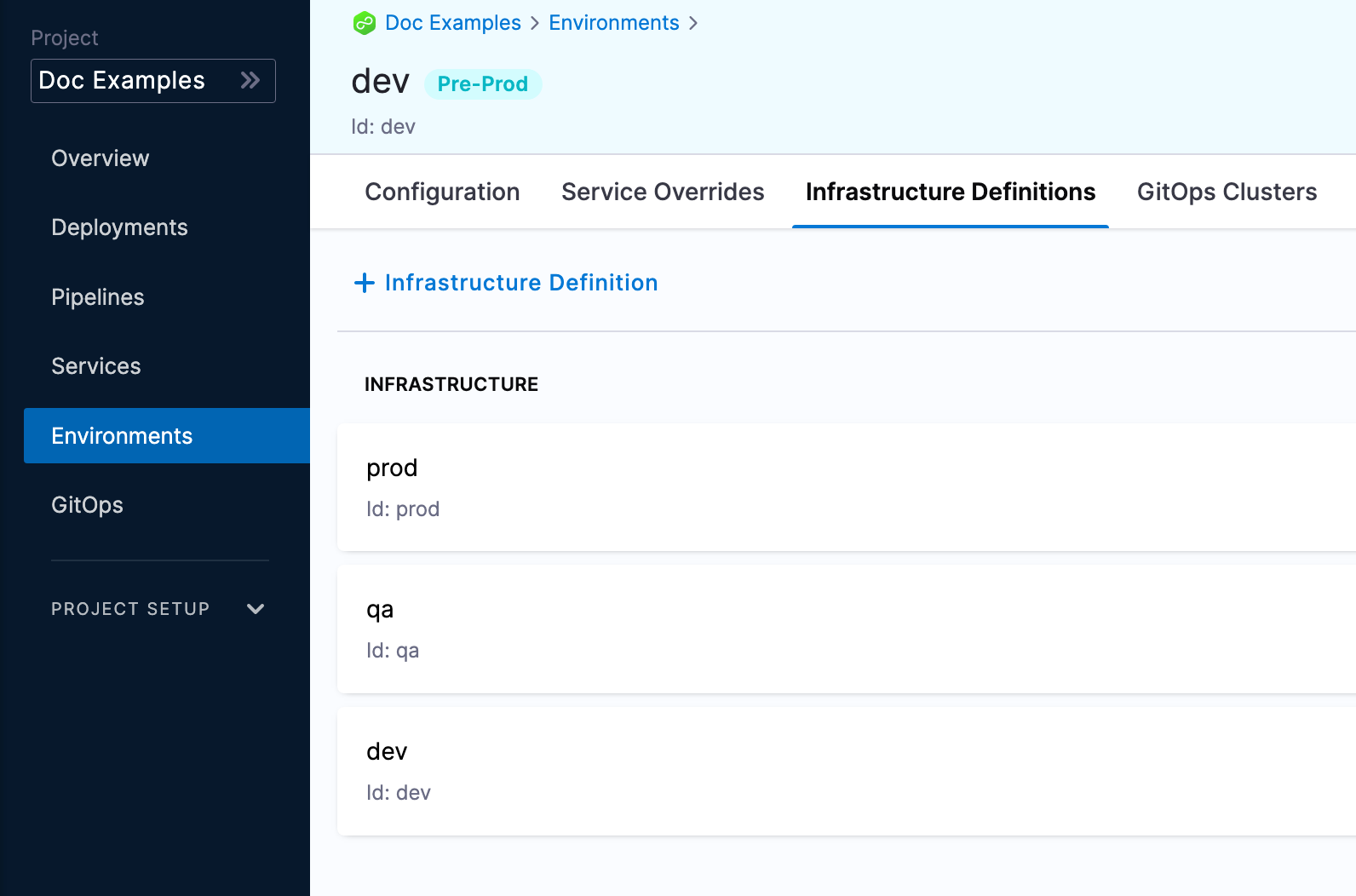 Environments represent your deployment targets (QA, Prod, etc). Each environment contains one or more Infrastructure Definitions that list your target clusters, hosts, namespaces, etc.