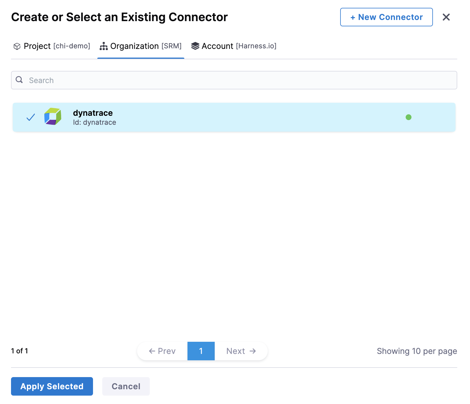 After selecting the connector, click Apply Selected. The Connector is added to the Health Source.