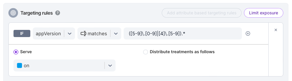 Serve the on treatment for users with custom attribute app_version greater than or equal to 16.0.0: