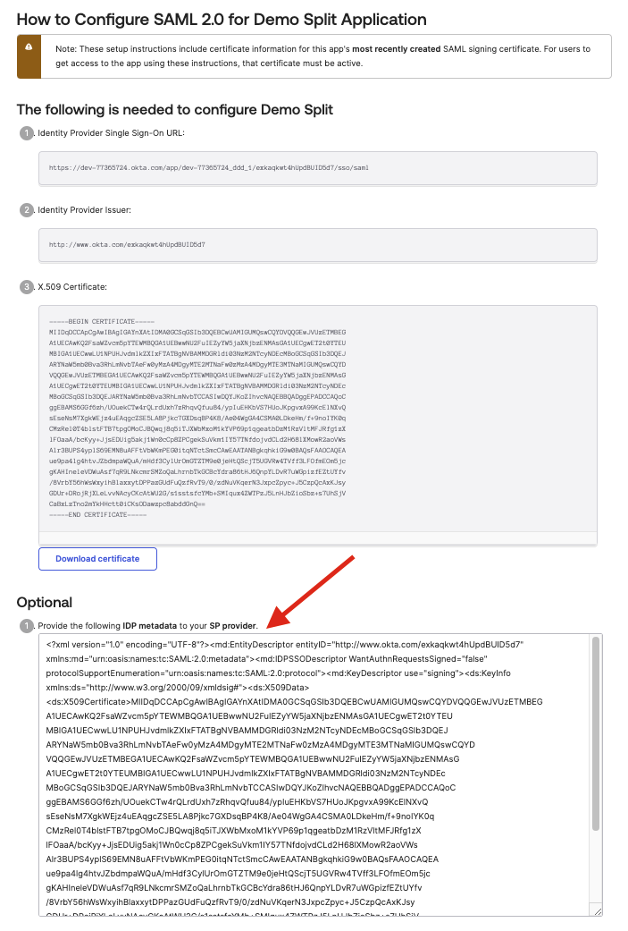 When you save these changes, you can view the summary of the SAML configuration parameters. You use this information when adding SAML settings in Okta.