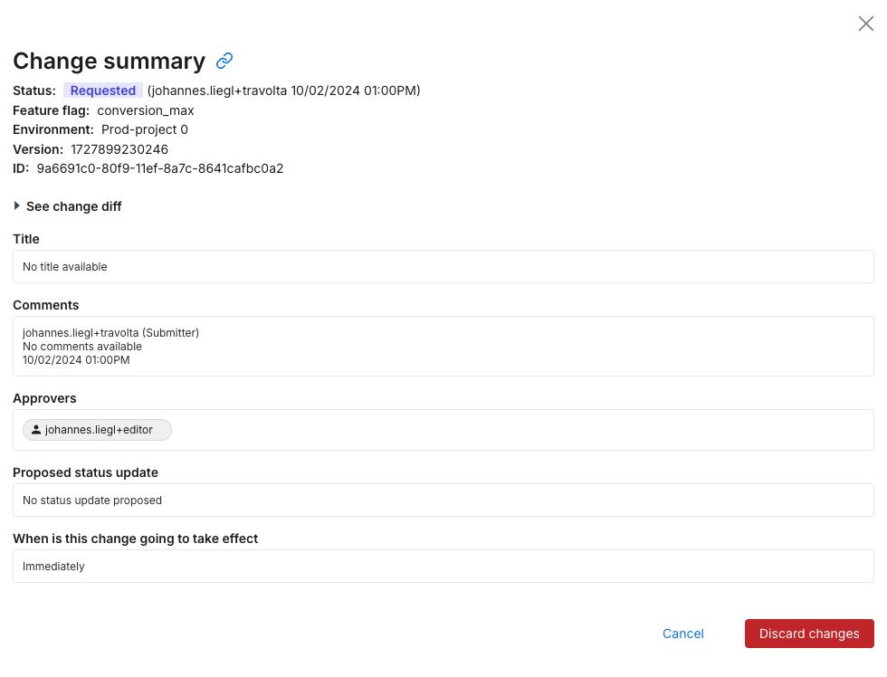 Additionally, you can also change permissions when you click the Review changes button on the Targeting rules page. This takes you to the Change summary page with the option to either click the Skip Approvals & Save link or go through the approval process similar to other users.