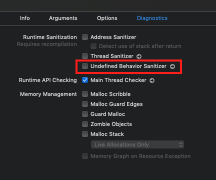 1. Disable the Undefined Behavior Sanitizer flag by navigating to your target’s Edit Scheme > Diagnostics tab and unchecking the Undefined Behavior Sanitizer option.