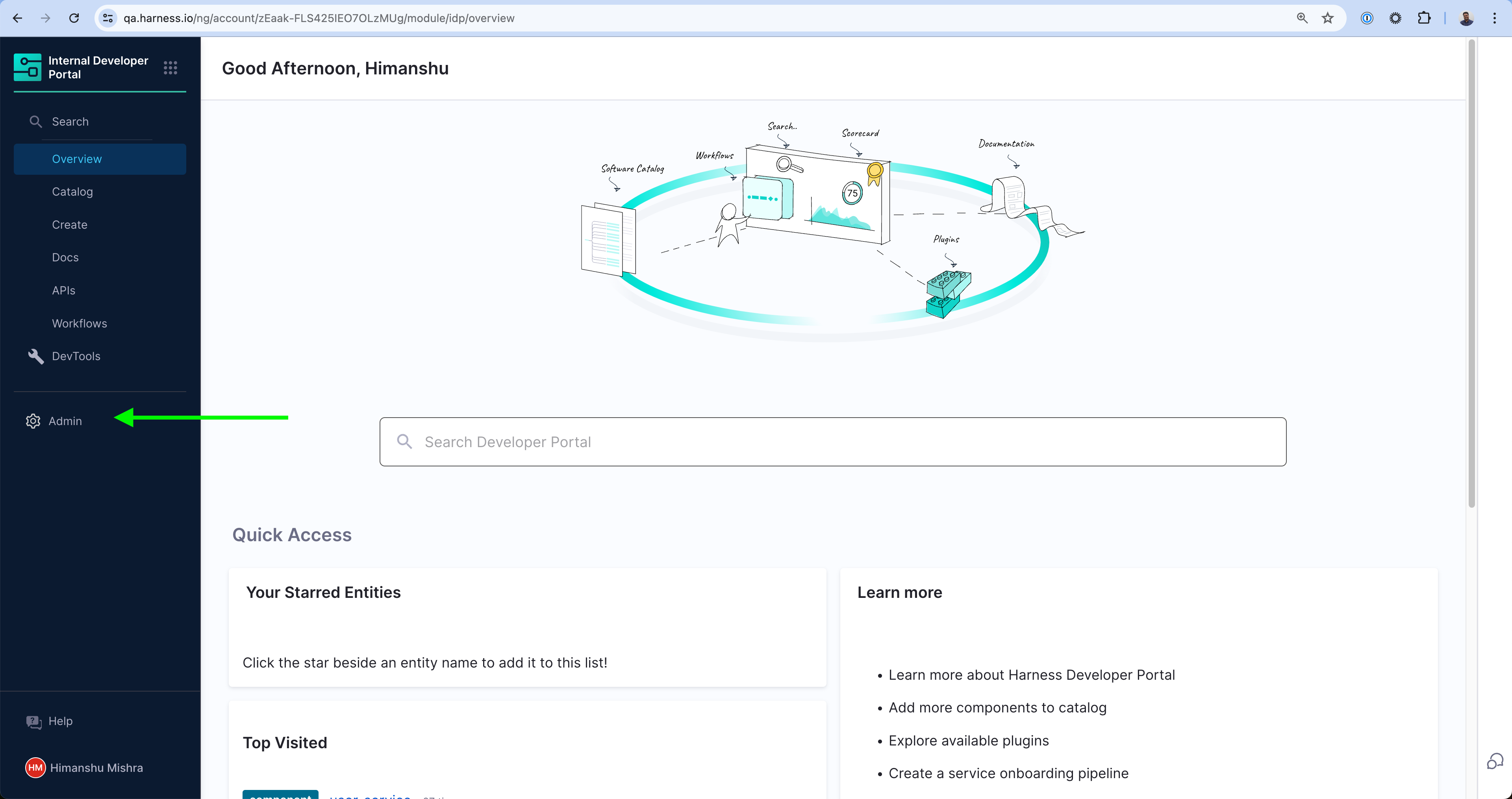 You can access the Sidenav Layout editor by navigating to Harness IDP and choosing Admin from the sidebar.