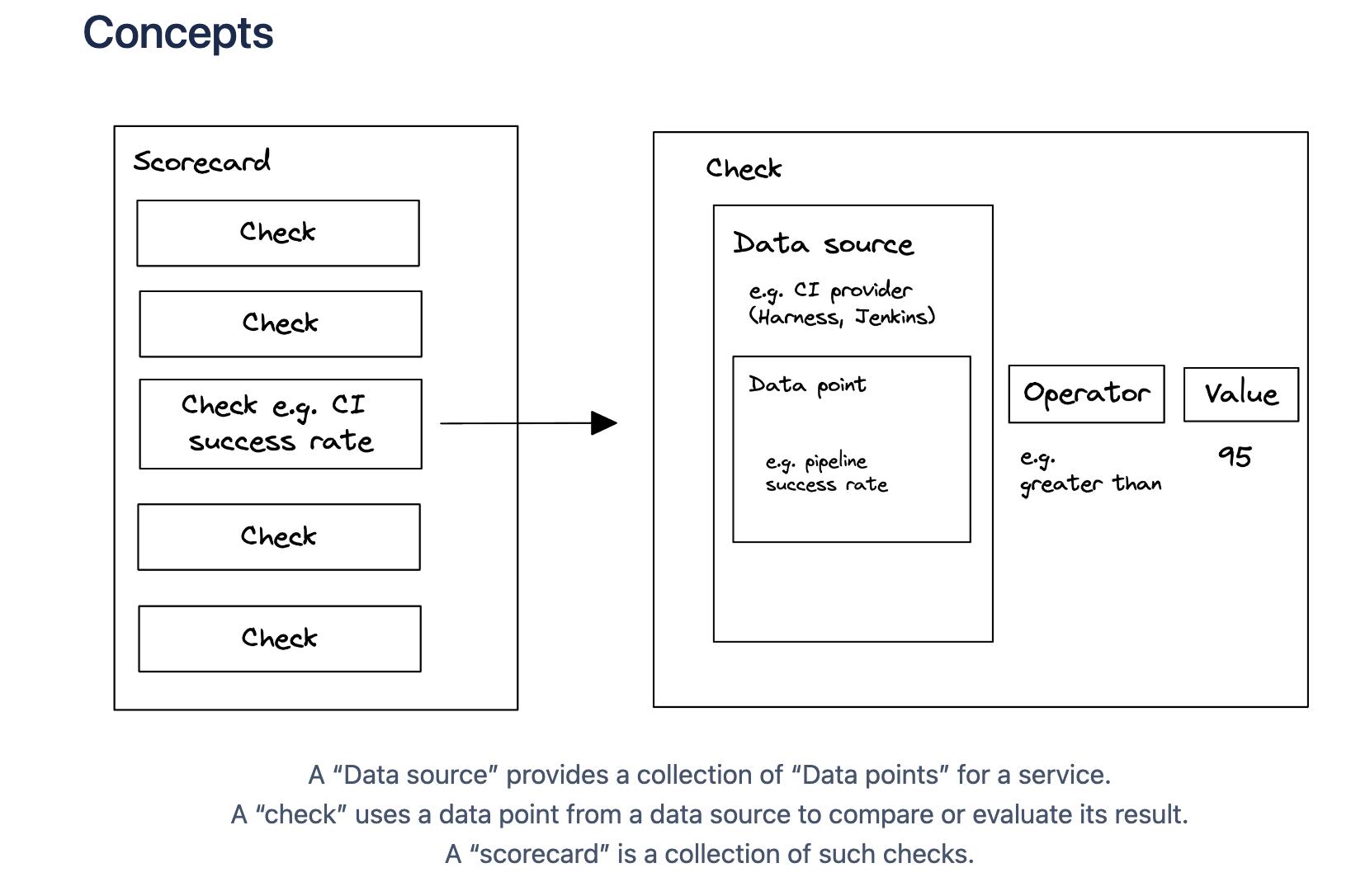 - Check: A check is a query performed against a data point for a software component which results in either
