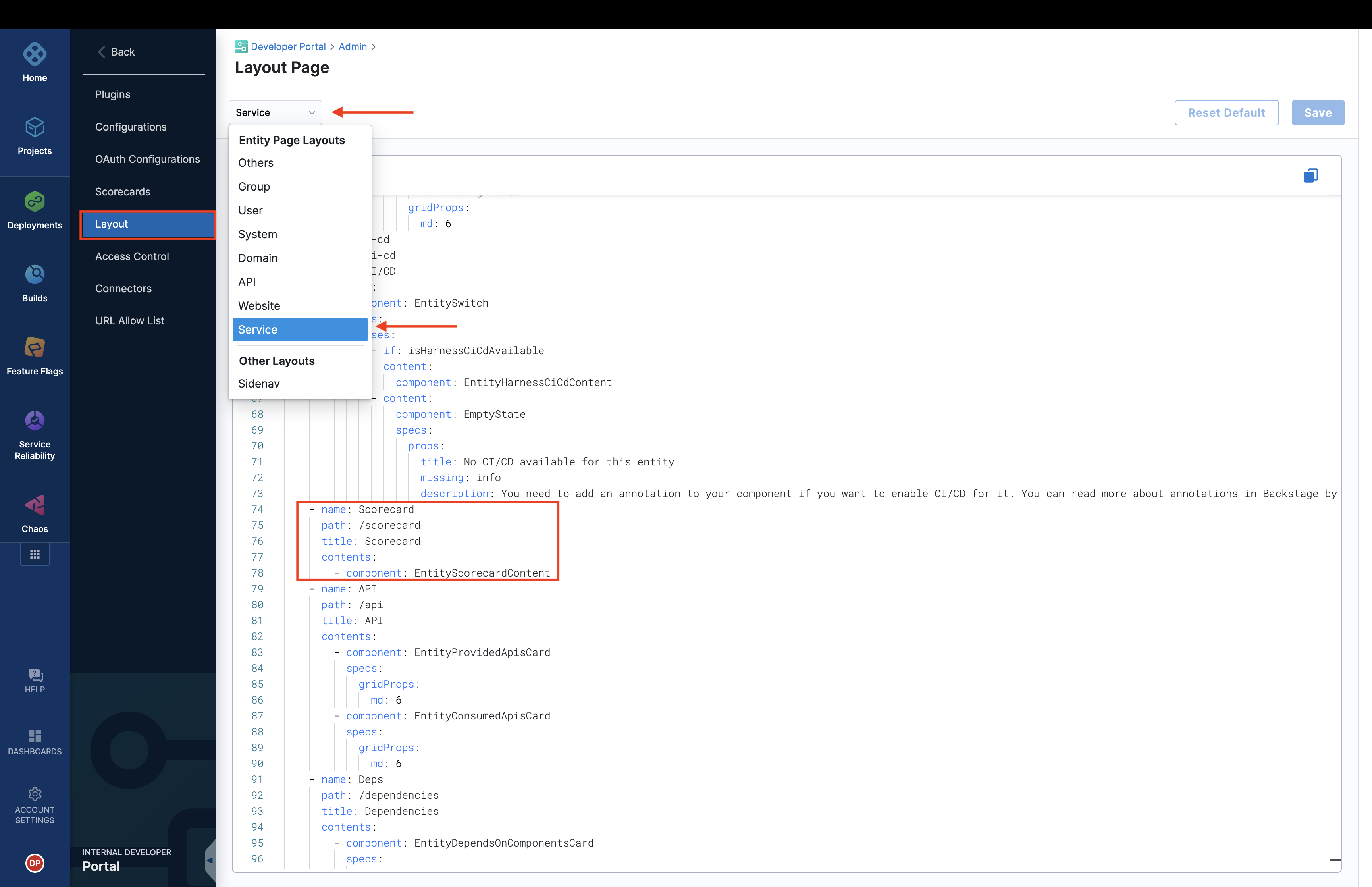 - Go to the Layout section in IDP Admin, and select Service or any other kind of catalog entity for which you want to add Scorecards.