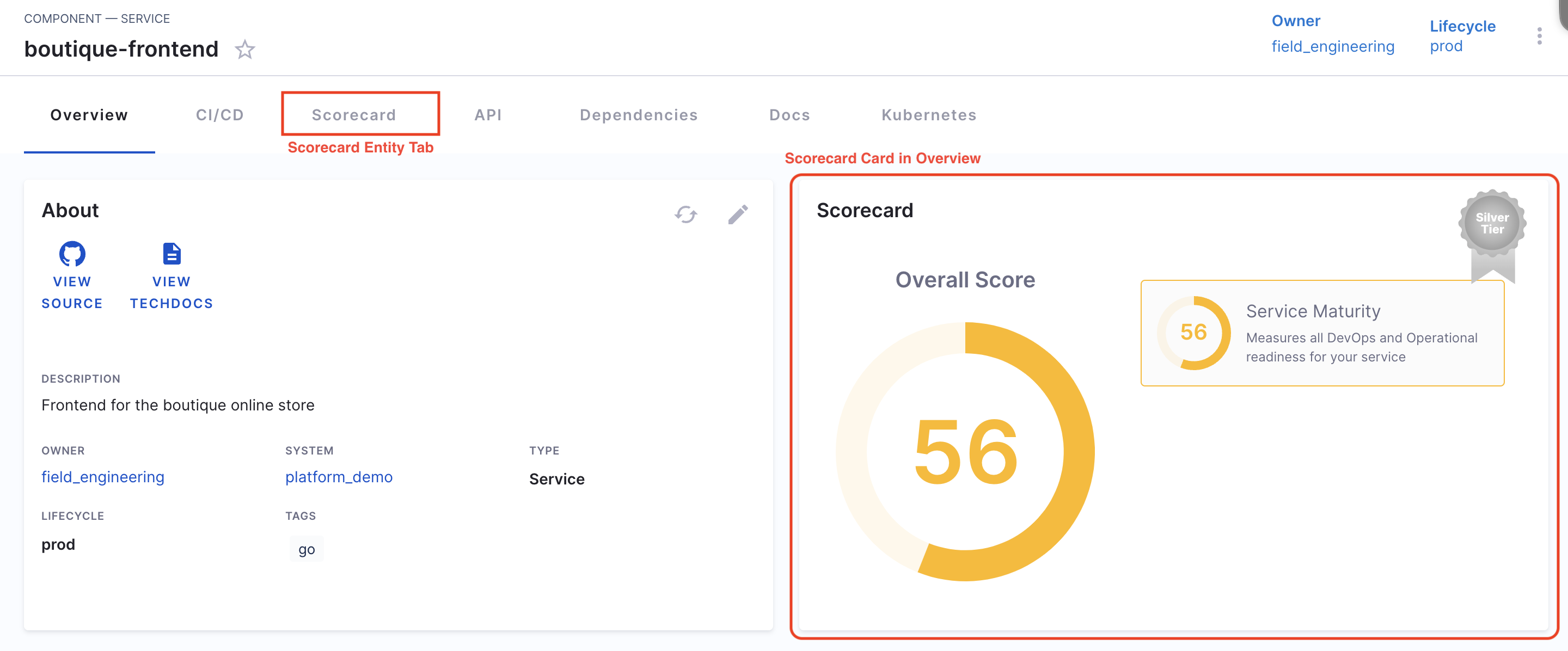 Scorecard has two main UI components which are developer facing and lives in the Catalog - 1. A small Card for the Overview page with the scores and, 2. A Tab view with details of the checks and how the score got computed. This is illustrated below. The Tab view contains detailed comprehensive information as shown in the image under overview