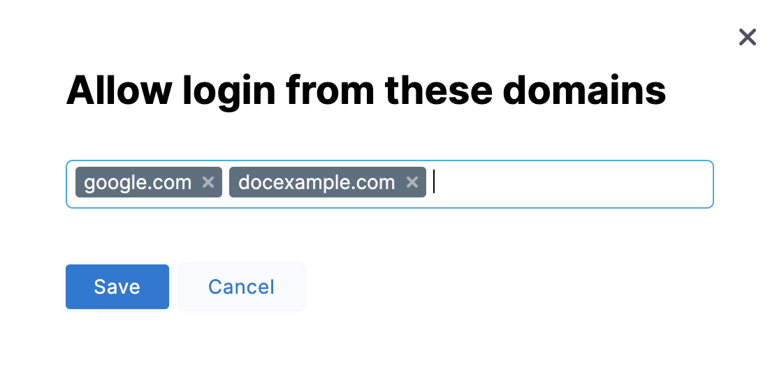 Select Only allow users with the following email domains: to allow (whitelist) only certain domains as usable in login credentials. In the dialog shown below, build your allowlist by simply typing your chosen domains into the Domains multi-select field.