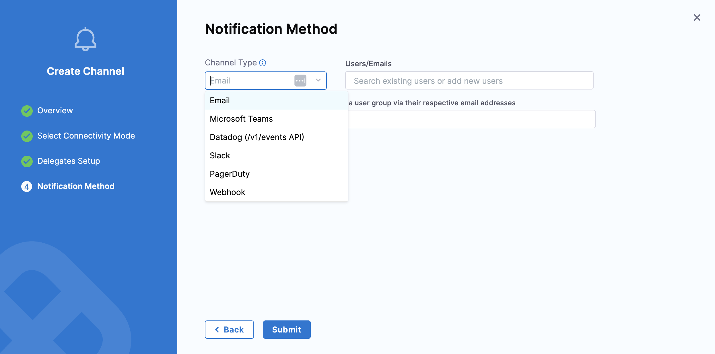 3. Notification Method: Once the connectivity mode is configured, select the Channel Type and add details related to the channel type to proceed.
