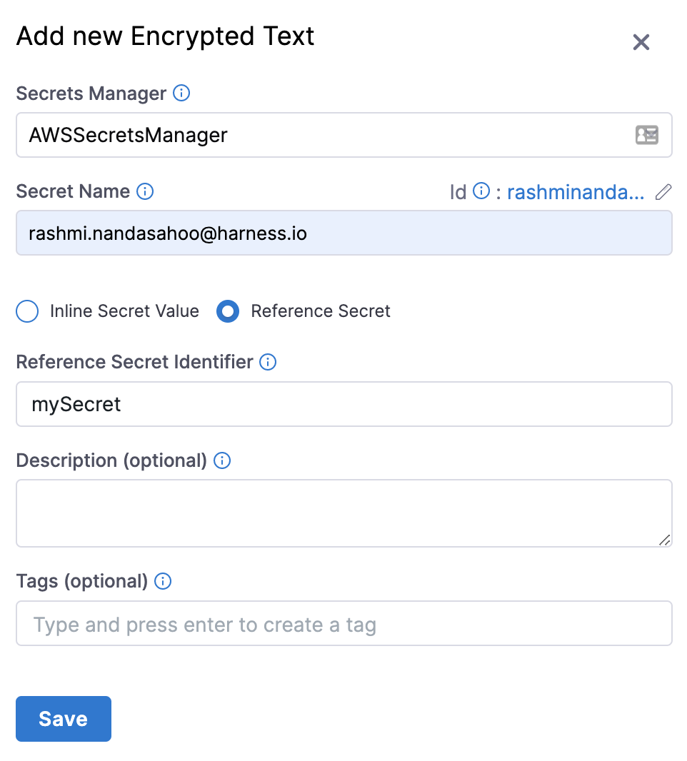 You can create a Harness secret that refers to an existing secret in AWS Secrets Manager using the name of the secret, and a prefix if needed. For example, mySecret