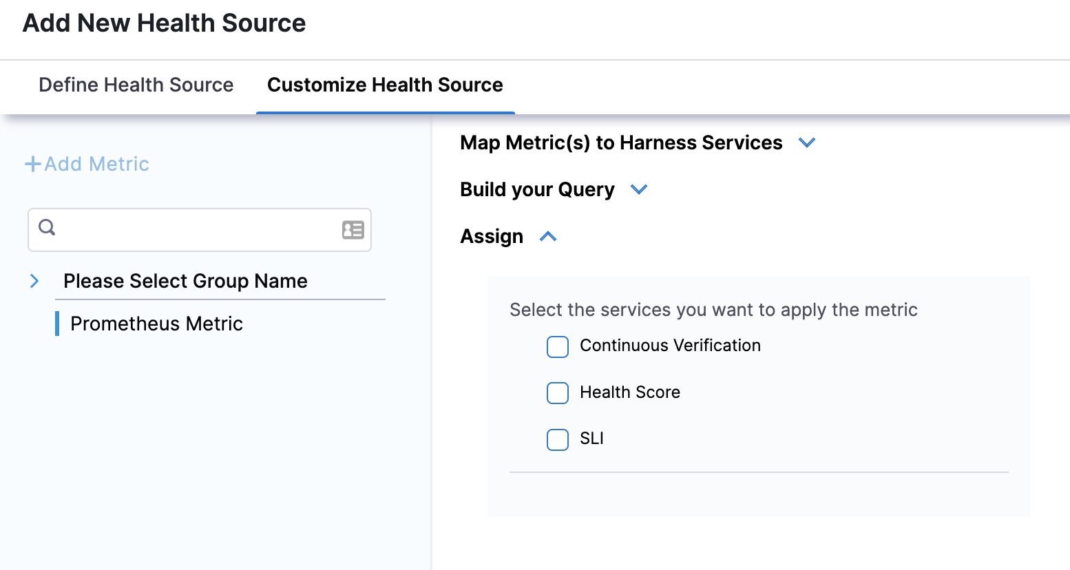 The subsequent settings in Customize Health Source depend on the Health Source Type you selected. You can customize the metrics to map the Harness Service to the monitored environment.