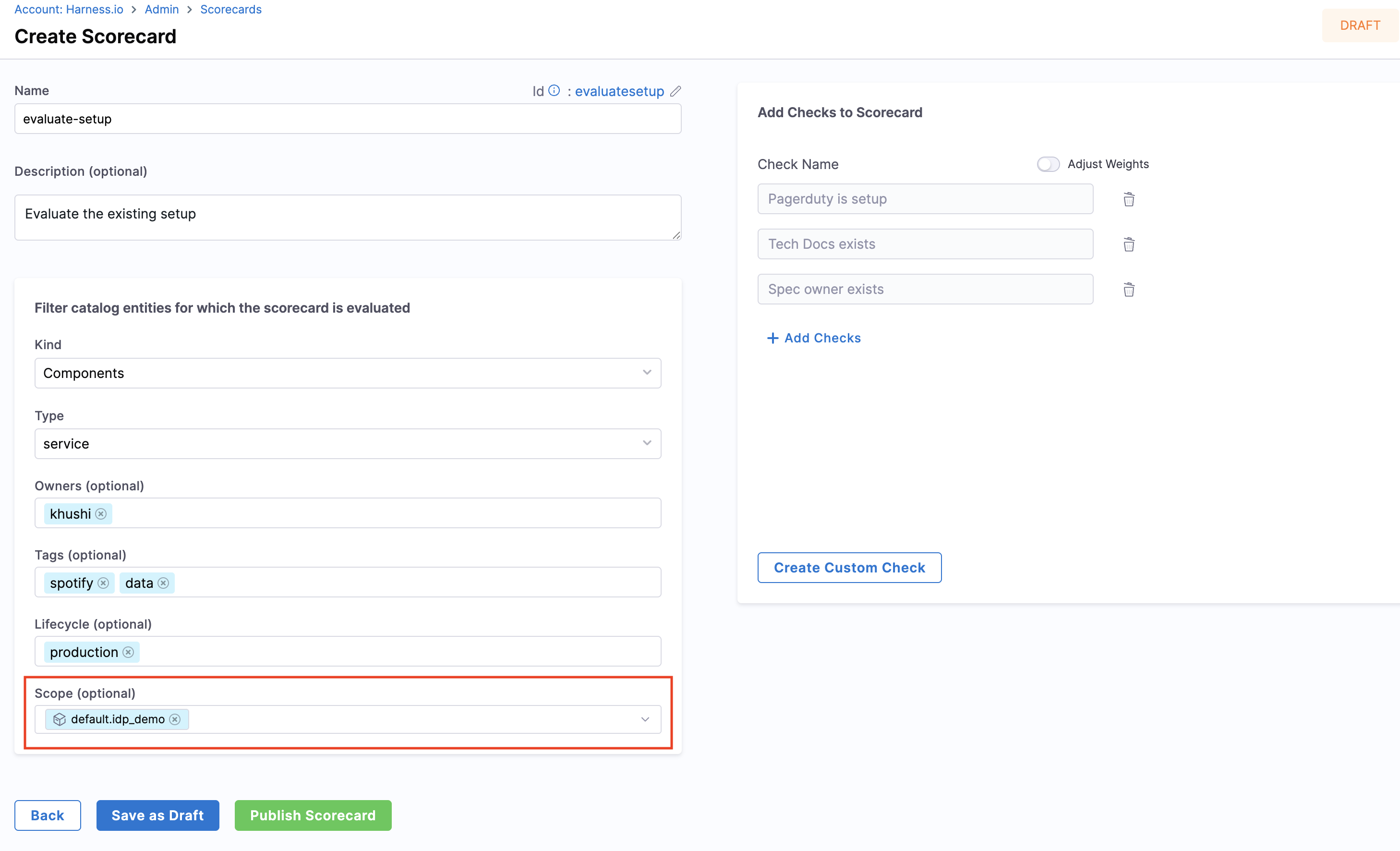 - If no scope is selected, the scorecard evaluates entities across all scopes (account, org, and project).