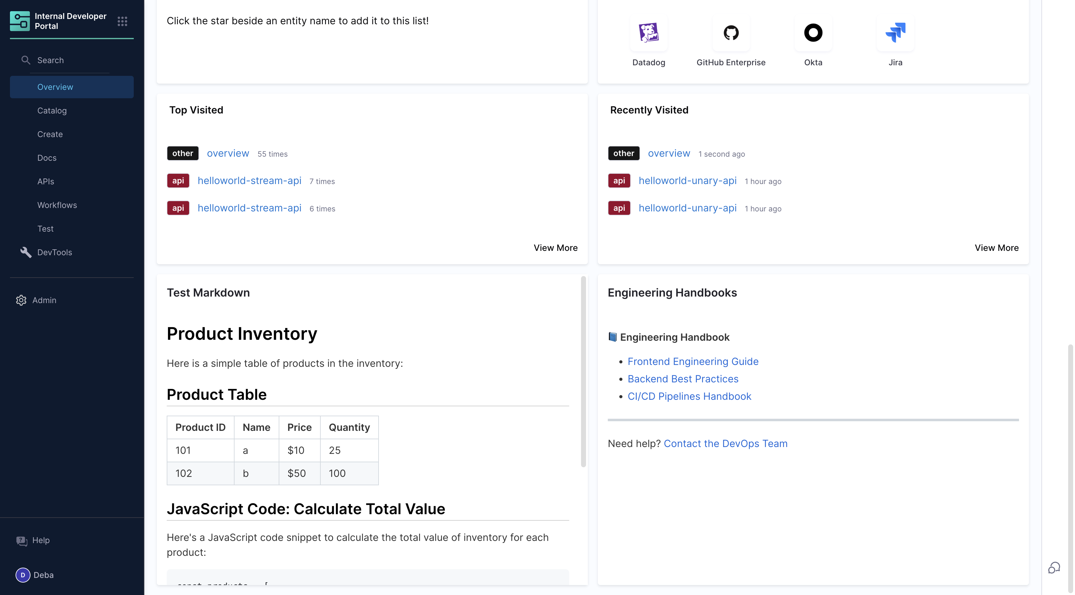 - External Content Integration - Add documentation, dashboards, or any web content directly in your IDP navigation